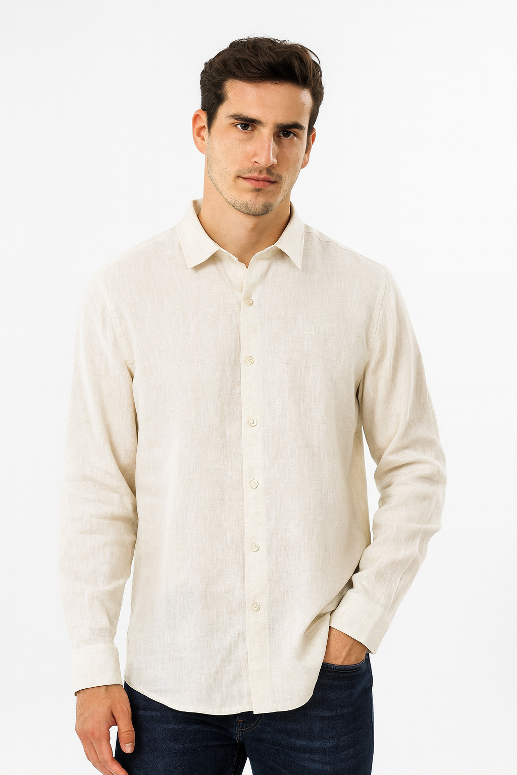 Camisa de lino en tono claro, ligera y transpirable, ideal para el clima cálido, Su diseño clásico con cuello camisero y botones frontales ofrece un estilo relajado pero elegante, perfecta para verano, playa o looks casuales.