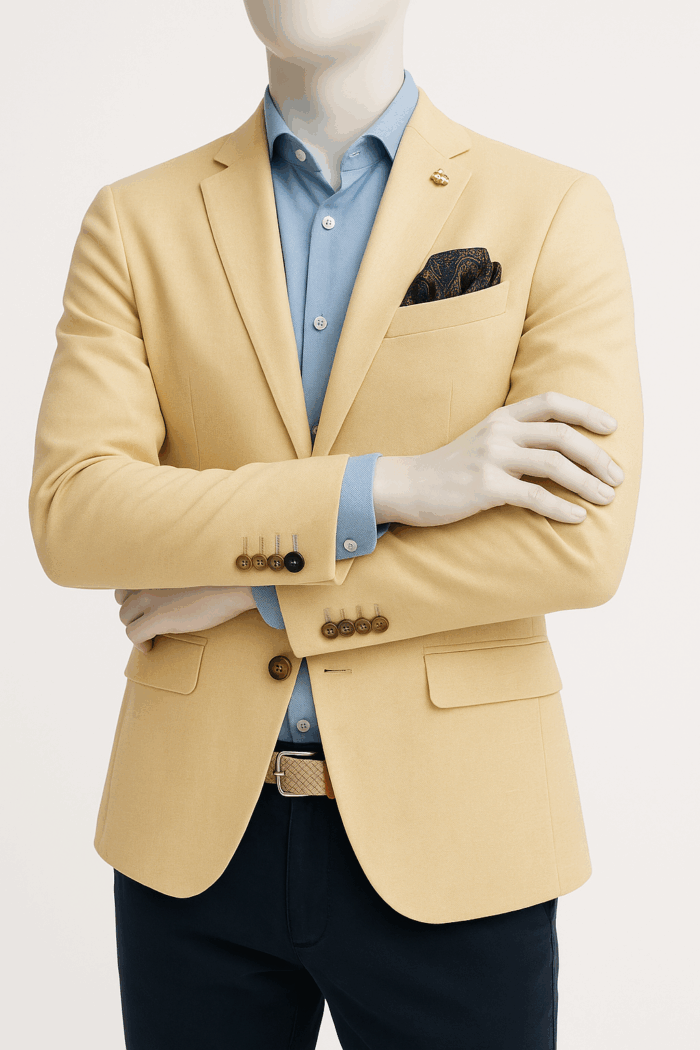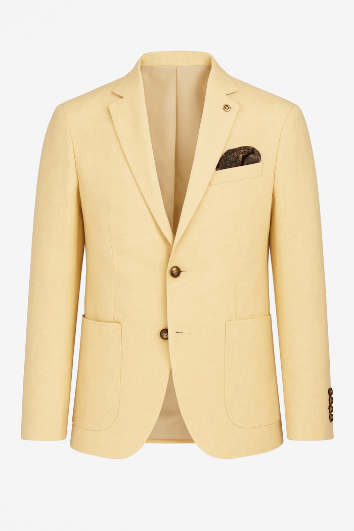Chaqueta de lino amarillo con bolsillos de parche y detalles celeste, fresca y elegante para un look lleno de estilo y vitalidad.