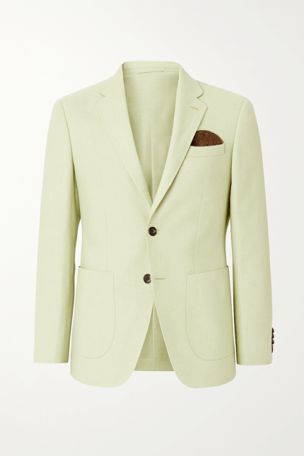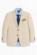 Chaqueta de lino beige con bolsillos de parche y detalles celeste, una prenda ligera y versátil que combina elegancia y comodidad.