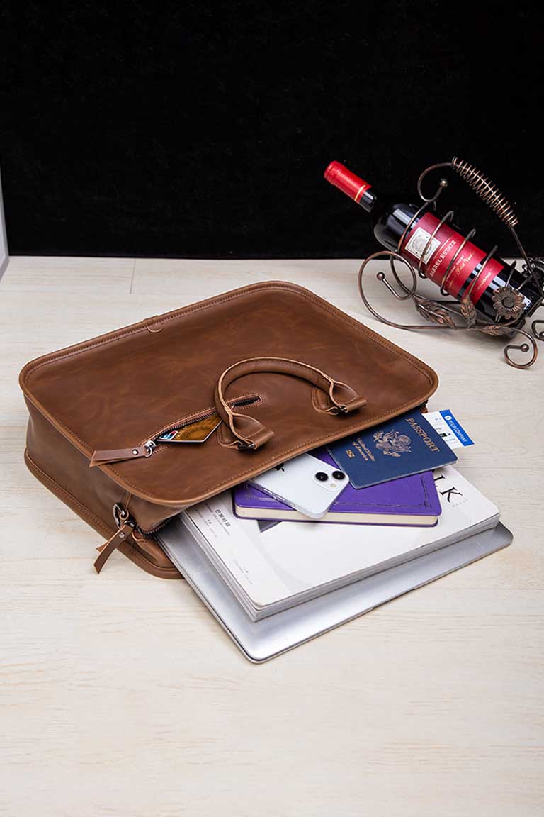 Su estructura firme pero ligera lo hace ideal para el día a día laboral, permitiendo transportar documentos, laptop y objetos personales con total comodidad. Incorpora asas reforzadas de cuero para un agarre cómodo y una correa ajustable y removible que permite llevarlo al hombro o cruzado, adaptándose a distintos estilos de uso.